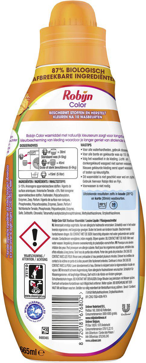 Robijn Klein & Krachtig Classics Color Vloeibaar Wasmiddel is speciaal ontwikkeld voor de gekleurde en bonte was. Dit dermatologisch goedgekeurde wasmiddel met natuurlijk kleurserum laat je was heerlijk ruiken en beschermt gekleurde kleding langdurig, waardoor je langer geniet van stralende kleuren. Het levert uitstekende resultaten, zelfs in koude (20 °C) en korte (30 minuten) wasbeurten, dankzij de verbeterde waskracht en vlekverwijdering. Deze wasmiddellijn van Robijn is ultrageconcentreerd. Met de vernieuwde formule hoef je slechts 30 ml in plaats van 35 ml te doseren voor een optimaal resultaat. Het wasmiddel is goed voor 22 wasbeurten, drie extra wasjes vergeleken met onze vorige formule van 2024. Dit wasmiddel bevat 87% biologisch afbreekbare ingrediënten*. Op deze manier draagt Robijn bij aan een duurzamere manier van wassen.